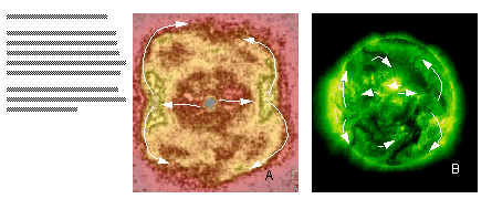 The entanglement of the loops forming the stellar surface seem to follow a specific pattern. The ejected gases, moving from the equatorial plane towards each poles, create braided structures when they meet. The similar braided pattern pile up over each other, as shells over shells, where larger shells envelop similar smaller shells. I have discussed this fractal stacking up of shells in an earlier chapter. This process of fractal build up continues down to the outer layers of the stellar surfaces. In other words, the bubbles continue to embossom smaller bubbles on each side of the poles, until reaching the centre, where the bubbles on the two sides merge to form the shape of the star. The structures of well evolved stars, where the jets and winds have cleared away the surrounding space, and the stars have taken near spherical shapes, will involve jets moving in the opposite direction from the centre along the equatorial plane. These jets will bend towards the poles and carry gases from the equators to the poles. This process will generate fractal shells embedded inside each other. When the gases and plasma meet at the polar regions they form knotted and braided structures, which act as magnetic "corcks" holding the mouths, through which the jets have been erupting in earlier stages of formation. They keep the material against escaping the core region. Reaching the pole the gases and plasmas are forced to sink inward from where they start their journey towards the stellar surface as ejections along the equator once again. Recent observations have confirmed this rising of gases from the equator to the poles moving along the surfaces, and then sinking of gases from the poles towards the equator in the deep interior of the sun. This circulation process generates two bow-shaped structures as two lobes which flank the stellar core. These bow-shaped structures are tied together at the top and bottom by the knots, which form when the masses moving towards the poles meet.
