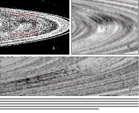 Not only the orbital paths of Prometheus and Pandora show unpredictable chaotic courses, the strands in the rings, which they are supposed to keep in place appear intricately braided and knotted.